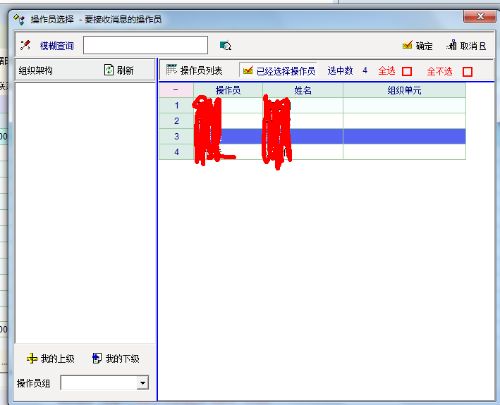 如图,消息通知出现时,默认显示的是《已经选择操作员》界面,《已经选择操作员》界面的右键菜单里只有去掉选项。建议将默认显示界面切换为《操作员列表》,或在《已经选择操作员》的右键菜单里也增加全选、全不选命令选项。