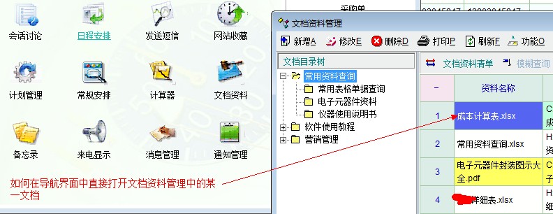 如图,可否在导航界面中直接打开文档管理中的某一文档?如果没有这个功能,建议添加!日常使用中,某些文档或资料全公司的人都非常频繁的需要使用到,如果可以直接在导航界面中打开,将带给我们非常大的方便!