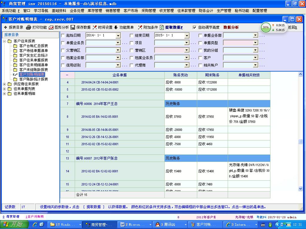 各位老师,我提一个很现实的问题,就是往来款的年终统计事情,不知为什么那么多会计居然没人提这个要求,但这却是每个企业都要用的数据: 我软件中有2013年产生的往来,也有2014年产生的往来,老板要2014年的产生的往来款,到2014.12.31日,还有多少应收?怎么提? 老板再问2013年那些应收,截止2014.12.31还有多少应收,怎么办? 这就是我目前要解决的事。 为了更清楚的看出问题所在,我把2012年产生的往来客户取名为2012年客户 以及2013年客户 2014年客户 1、首先我截图,客户对帐明细(不选日期)附近1,明显的可以看到,到2015,2.5客户的明细,如2014年客户王总到2015.2.5应收款是4450元。它在2014,12,31前应收款是11950元 2、客户台帐也是以截止到当有也就是2015.2.5为计算日的,可以看出当前客户2014年客户王总的应收款是4450元。同时也看出明细列出的是历年的客户(有2012年的,有2013年的,2014年的)(见附近2) 3、在客户待结清单中,我选了日期为2014.1.1--2014.12.31,出来的明细是2014年的客户王总的待结明细。但是他显示的等结也是算到2015.2.5,为4450元。实际此客户到2014.12.31,应收款为11950元。(见附件3) 以上都无法实现我要的数据。 此问题和夏老师电话交流过。夏老师是目前最了解我问题的人。现在等夏老师建个数据库确认。 |