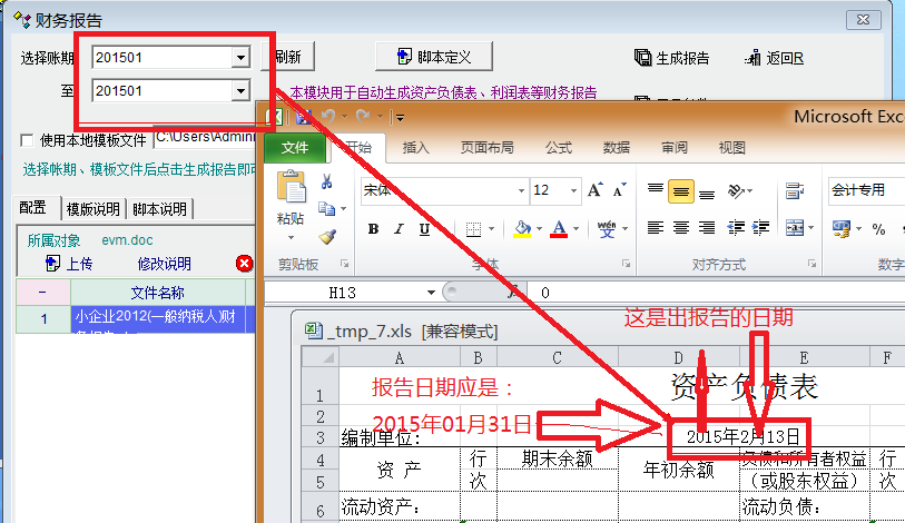(问题出在资产负债表中的单元格内的“?报告日期”函数),另把利润表和现金流量表内单元格的“?报告日期”修改成“?周期”,这样就正确了。最好把dll内的excel财务报告都修改下再发布。
