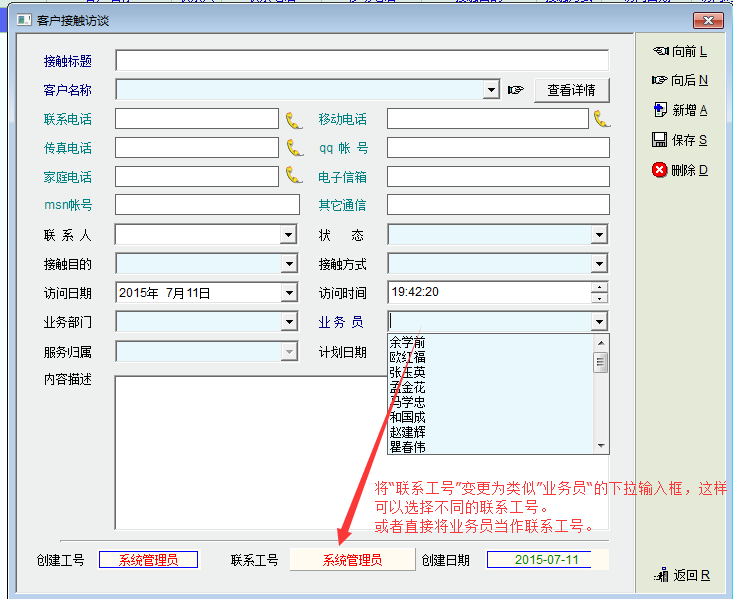 如图,建议将“联系工号”更改为类似“业务员”下拉输入框用以在必要的时候可以指定接触访谈计划的执行员工。或者直接将业务员作为计划的执行人。
