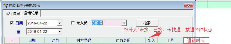 如图,建议在电话助手中增加通话时长与通话状态(未接、已接、未拔通、拔通)两项内容。也可以将现在的“出入”记录内容再细分成未接、已接、未拔通、拔通4种状态,这样更符合日常使用要求。