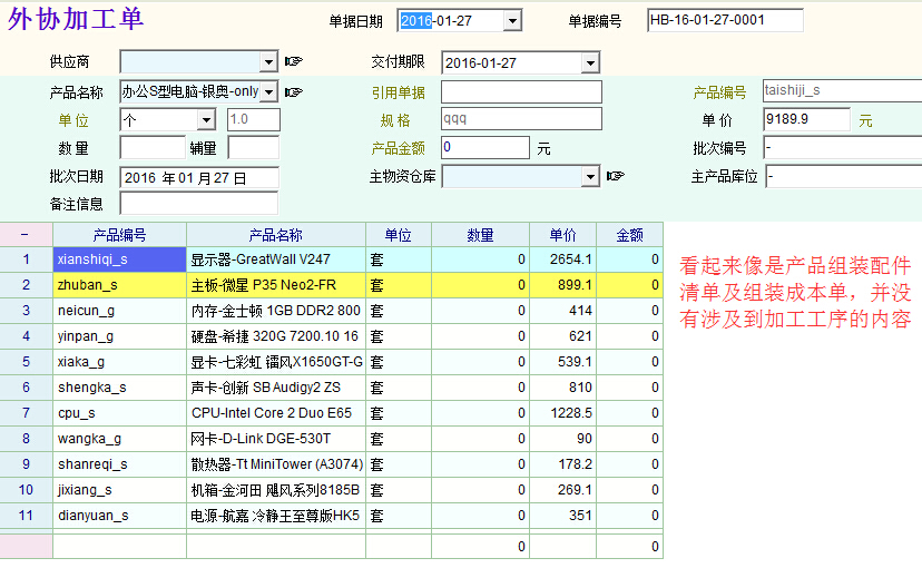 加工单中的单价指的应该是加工工序的单价,金额对应的应该是加工金额(加工费用)才对。现在系统中对应的是产品的单价及产品金额。演示库中的加工单怎么看都像是产品的组装成本计算单(就是列出某个产品由什么东西组成 ,并计算该产品组成的配件数量及的成本)而不是加工单
