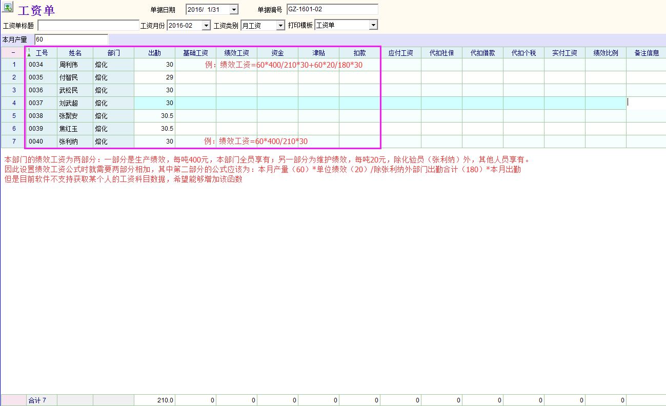软件的工资管理模块中,工资计算公式只支持获取部门工资科目的合计数,有的时候需要获取某个人的工资科目数据,但是软件目前不支持,希望能够改进。附图