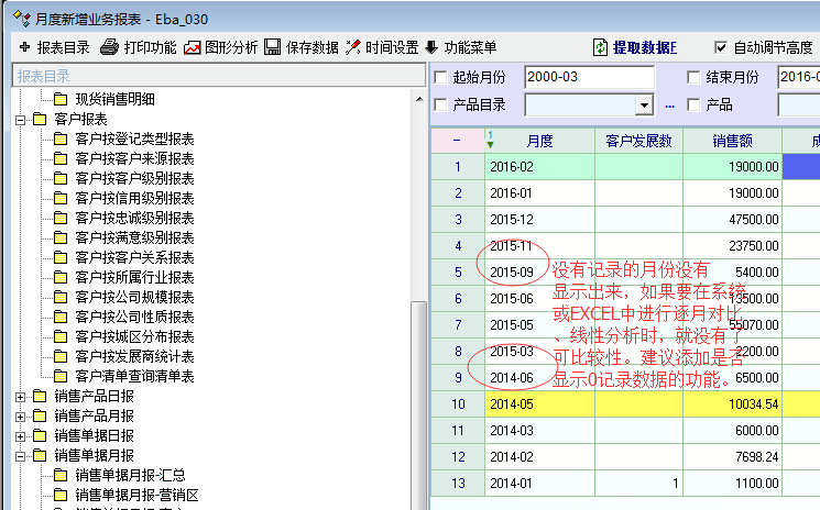 如图,报表分析中对数据的分析经常要求在时间上是连续的,但系统中的许多报表在按月份统计或按日统计时当期数据为0时,报表就没有显示当期数据,忽略了。建议系统中添加是当统计数据为0时是否显示该记录的功能。