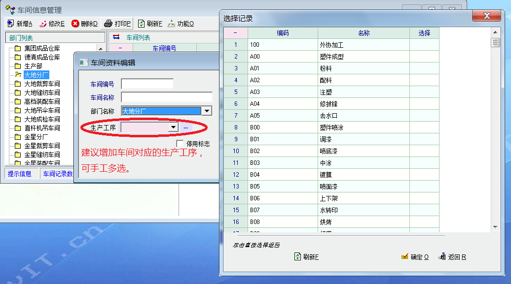 车间资料里建议增加对应的工序,允许多选,字段内容可以保存为: