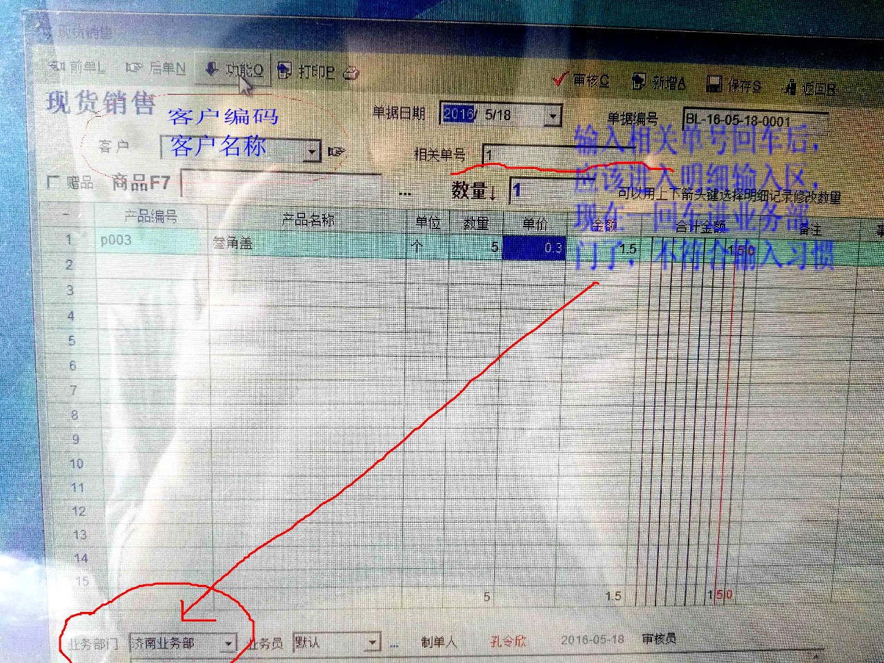 2、 输入相关单号回车后,应该进入明细输入区,现在一回车进业务部门了,不符合输入习惯。如图
