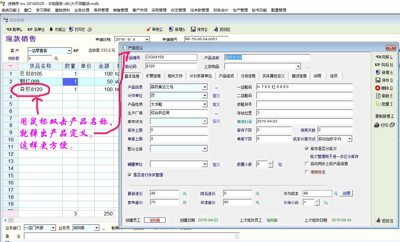 老师您好:在单据记录界面上,用指针指向产品名称,按Ctrl+G组合键时能弹出产品定义的界面,双手并用,(包括点击底部的那个)不太方便,我认为这个方式改成用鼠标双击产品名称,就弹出产品定义。这样更方便。软件方便好用是硬道理。一家之言。谨供参考。谢谢。