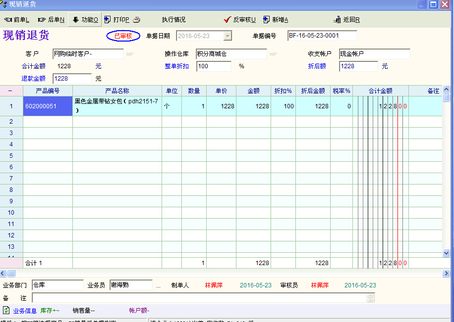 楼上,如如你所说,表头和表单算退了两次款的话,那表报中的“折扣后金额”为何又为-1228呢?