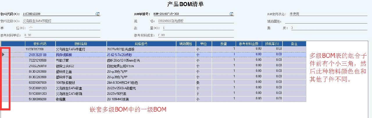 比较强大的多级嵌套BOM是这样的。