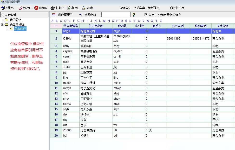 供应商管理中 建议供应商被单据引用后不能直接删除,删除是有提示信息,和删除资料转到"回收站"。