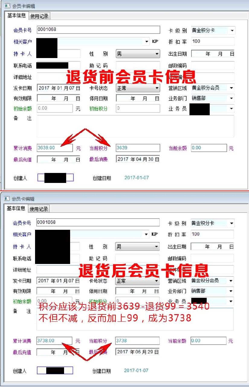 发生退货业务时,退货额不但不减相应积分,反而把退货额做为消费额累加进积分。