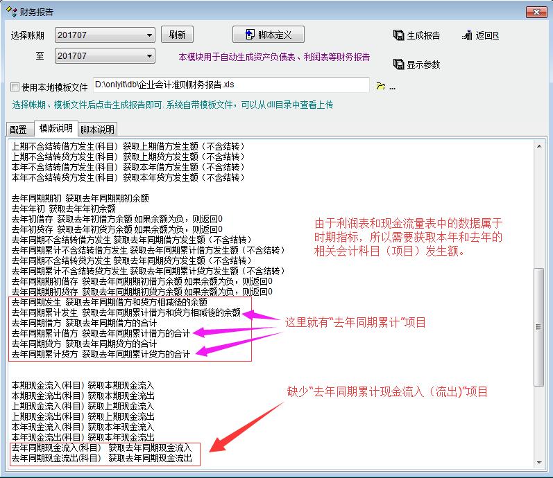 软件的报告模板定义近来新增了许多项目,大大方便了朋友们自定义的需求。软件与正常的财务报告对于“本期”与“上期”的定义是不同的,软件中“本期”一般指的是“本月”,“上期”指的是“上月”;但是在实务中,“本期”指的是“本年”,也就是从年初至报告期间末,“上期”则指对应的去年同期数据。因此,正式的财务报告就需要采集去年的相应数据,目前软件对资产负债表和利润表的支持已经完全可以满足要求,但是现金流量表模板中只有“去年同期现金流入(流出)”项目,没有“去年同期累计现金流入(流出)”项目,建议增加该选项。