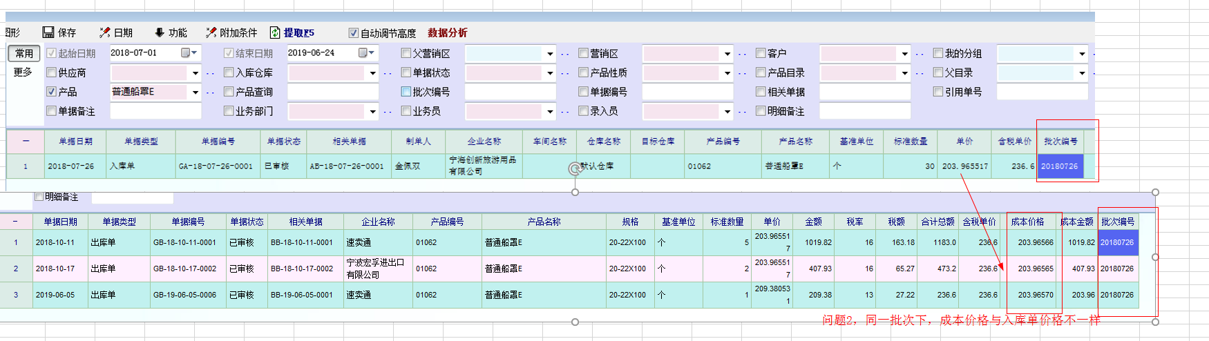 批次核算法下,问题一:同一出库批次不同的价格;问题二:出库批次与对应的入库批次价格不一样。如果只能上传一张图,请看回复图片