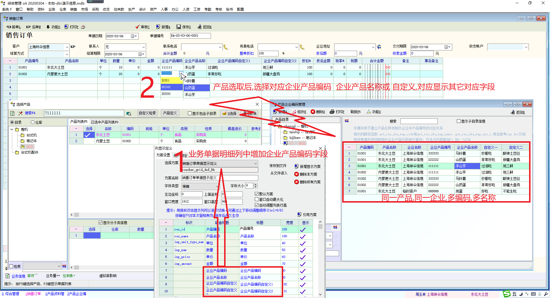 如图所示 产品编码不同企业对照虽然有脚本对应,并不能体现该功能的强大,希望能增强 1.业务单据中 明细列表定义 中增加 不同企业产品编码 名称 自定义 相应字段 2.对同一产品 同一企业,多编码,多名称的使用 业务单据产品选取后,在不同企业产品编码或名称中,输入对应编码或名称,对应自动填写其它相应字段 或者直接类似字典操作,直接选取不同企业产品编码或名称,对应自动填写其它相应字段 |